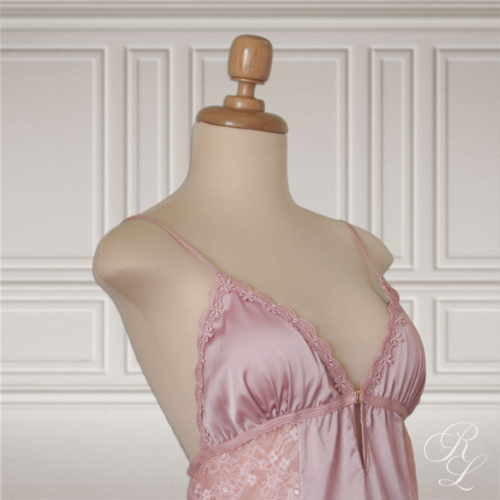 Babydoll satinado con encaje floreado. Con copas para mayor soporte. Tela ligera, sedosa y delicada. Espalda baja con tiras cruzadas para un look sensual.