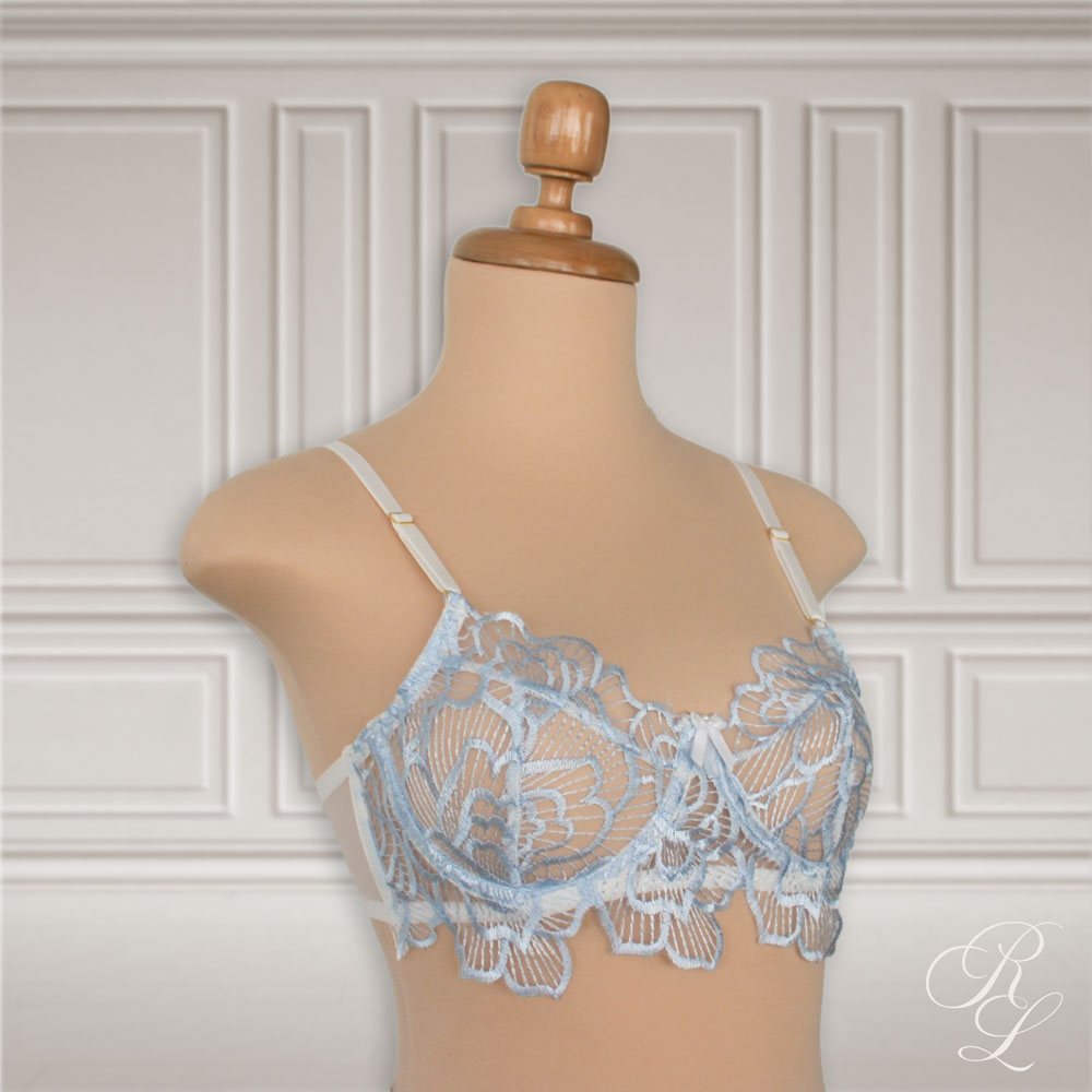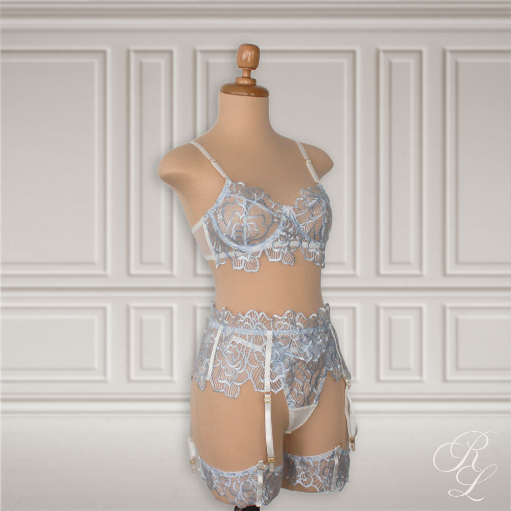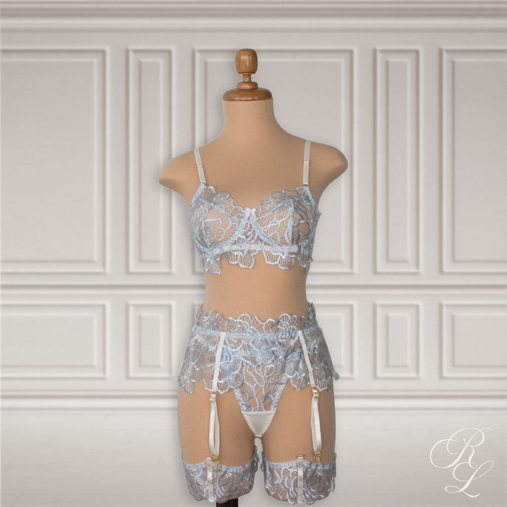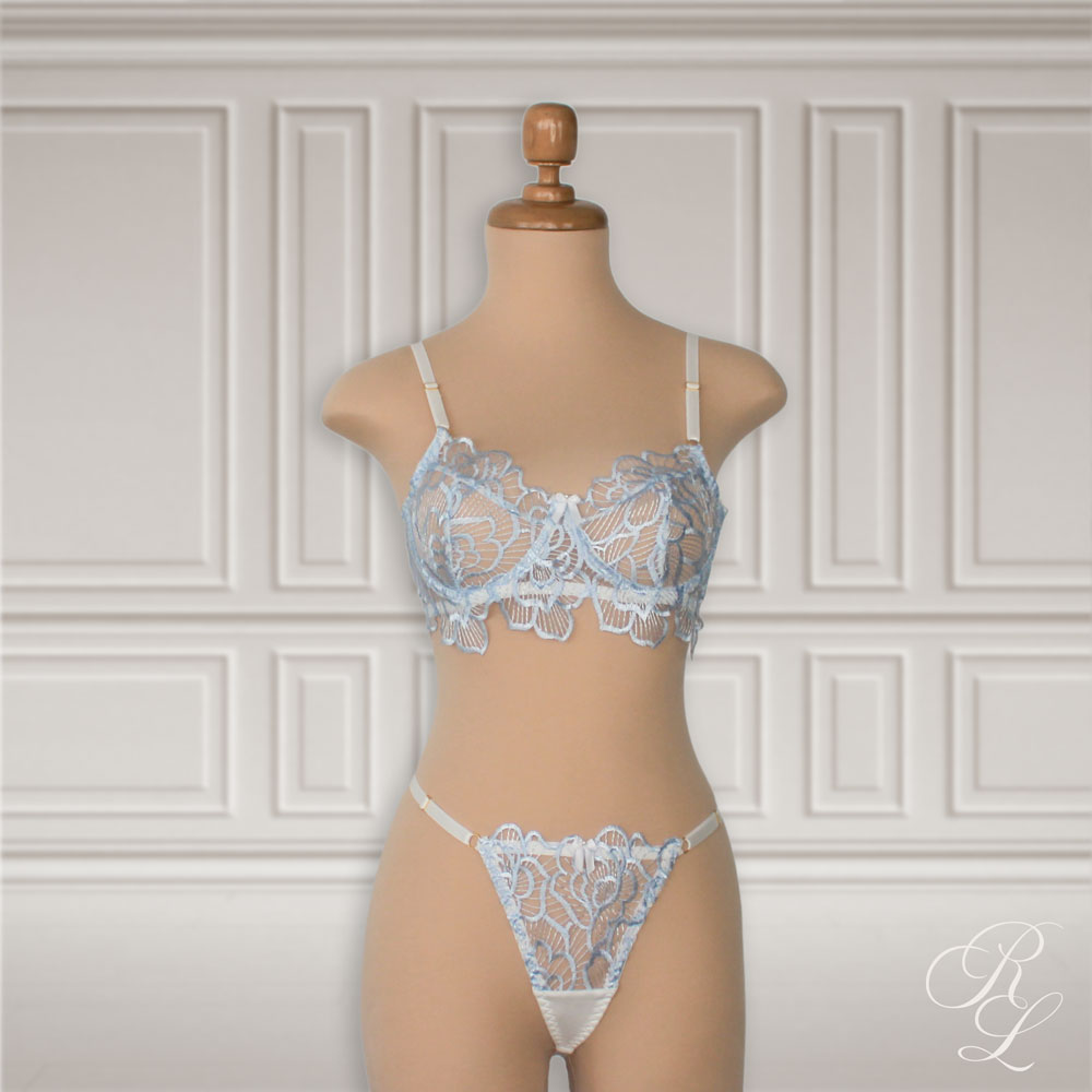Set de sostén, panty tipo hilo y sujetadores, todos hechos con encaje floreado color celeste bebé. Tres piezas de estilo romántico que pueden usarse juntas o por separado.