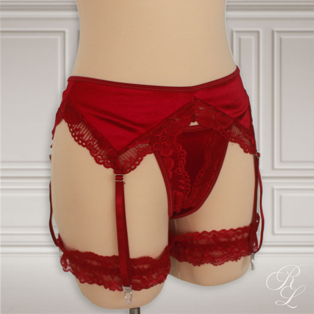 Sensual juego de 3 piezas con sostén, panty tipo hilo y sujetadores con ligas. Con tela satinada de tono rojo intenso para lucir divina.