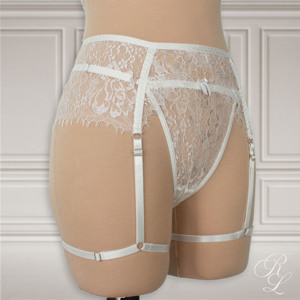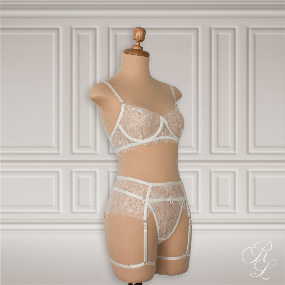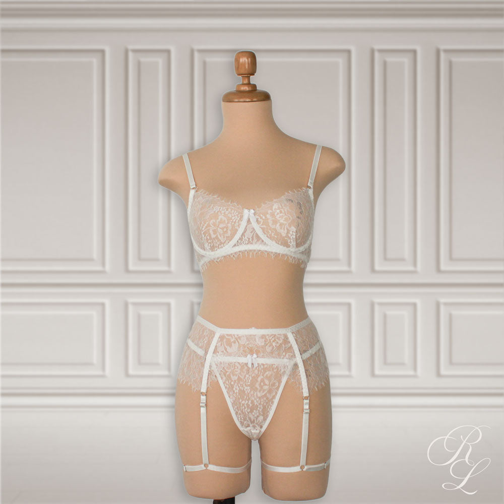 Set de sostén, panty tipo hilo y sujetadores hechos de encaje fino. Es un juego de 3 piezas de acabado sensual y sofisticado.